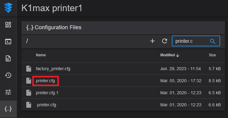 Open the Fluidd web interface of your K1. It should be located on an address similar to http://192.168.0.200:4408. Go to the Configuration page and locate printer.cfg.